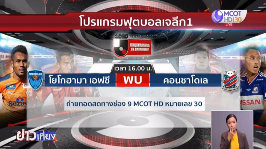 สำหรับแฟนบอลชาวไทย สามารถติดตามการถ่ายทอดสดโยโกฮามา เอฟซี พบ คอนซาโดเล ซัปโปโร ในเย็นวันพรุ่งนี้ ได้ทางช่อง 9 MCOT HD หมายเลข 30 ในเวลา 16.00 น. ตามเวลาประเทศไทย.-สำนักข่าวไทย