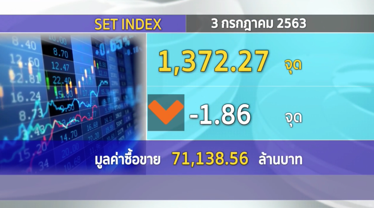 กทม. 3 ก.ค.- ตลาดหลักทรัพย์ ปิดวันนี้ที่ระดับ 1,372.27 จุด ลดลง 1.86 จุด (-0.14%) มูลค่าการซื้อขาย 71,138.56 ล้านบาท.-สำนักข่าวไทย