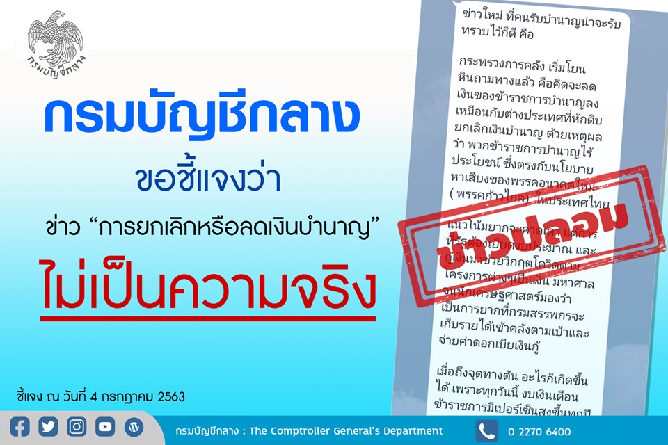 ทั้งนี้ กรมบัญชีกลางในฐานะหน่วยงานที่กำกับดูแลเกี่ยวกับเงินบำเหน็จ บำนาญข้าราชการ ขอชี้แจงว่า ข้อความข้างต้นไม่เป็นความจริง ปัจจุบันกรมบัญชีกลางยังไม่ได้รับนโยบายให้ลดหรือยกเลิกการจ่ายเงินบำนาญให้แก่ข้าราชการบำนาญ อีกทั้งพระราชบัญญัติบำเหน็จบำนาญข้าราชการ พ.ศ. 2494 และที่แก้ไขเพิ่มเติม ได้นิยามคำว่าบำนาญ หมายถึง เงินตอบแทนความชอบที่ได้รับราชการมา ซึ่งจ่ายเป็นรายเดือน กล่าวคือ มีเจตนารมณ์ที่จะตอบแทนการเสียสละปฏิบัติงานให้กับประเทศมาด้วยดีเป็นระยะเวลาหนึ่ง ดังนั้น จึงขอเตือนให้ผู้ที่เกี่ยวข้อง อย่าหลงเชื่อข้อความดังกล่าว ทั้งนี้ ขอให้ติดตามข่าวสารจากช่องทางต่าง ๆ ของกรมบัญชีกลางเท่านั้น หรือสอบถามได้ที่ Call Center กรมบัญชีกลาง 02 270 6400 . – สำนักข่าวไทย