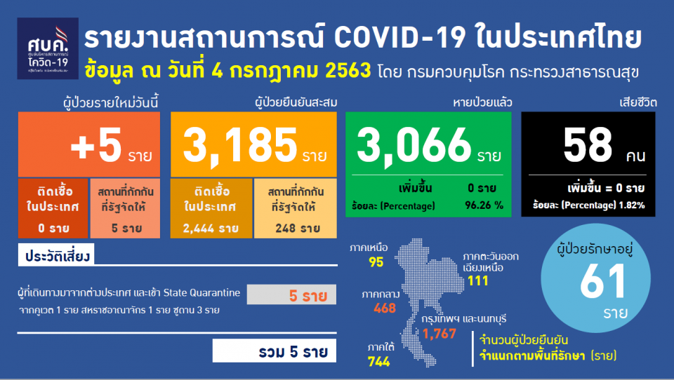 BANGKOK, July 4 (TNA) – The Center for COVID-19 Situation Administration reported five new cases of the coronavirus disease 2019 (COVID-19) infection, all of whom are returnees detected during state quarantine.
