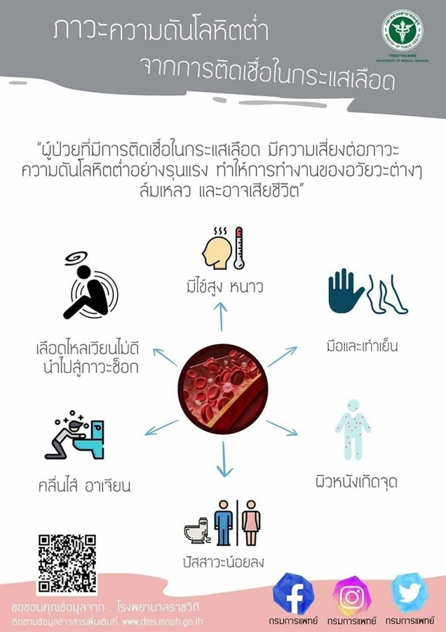 สำนักข่าวไทย 6ก.ค.-กรมการแพทย์ โดยโรงพยาบาลราชวิถี เตือนผู้ป่วยที่มีการติดเชื้อในกระแสเลือดมีความเสี่ยงที่จะมีภาวะความดันโลหิตต่ำอย่างรุนแรง นำไปสู่ภาวะอวัยวะล้มเหลวและอาจทำให้เสียชีวิตได้
