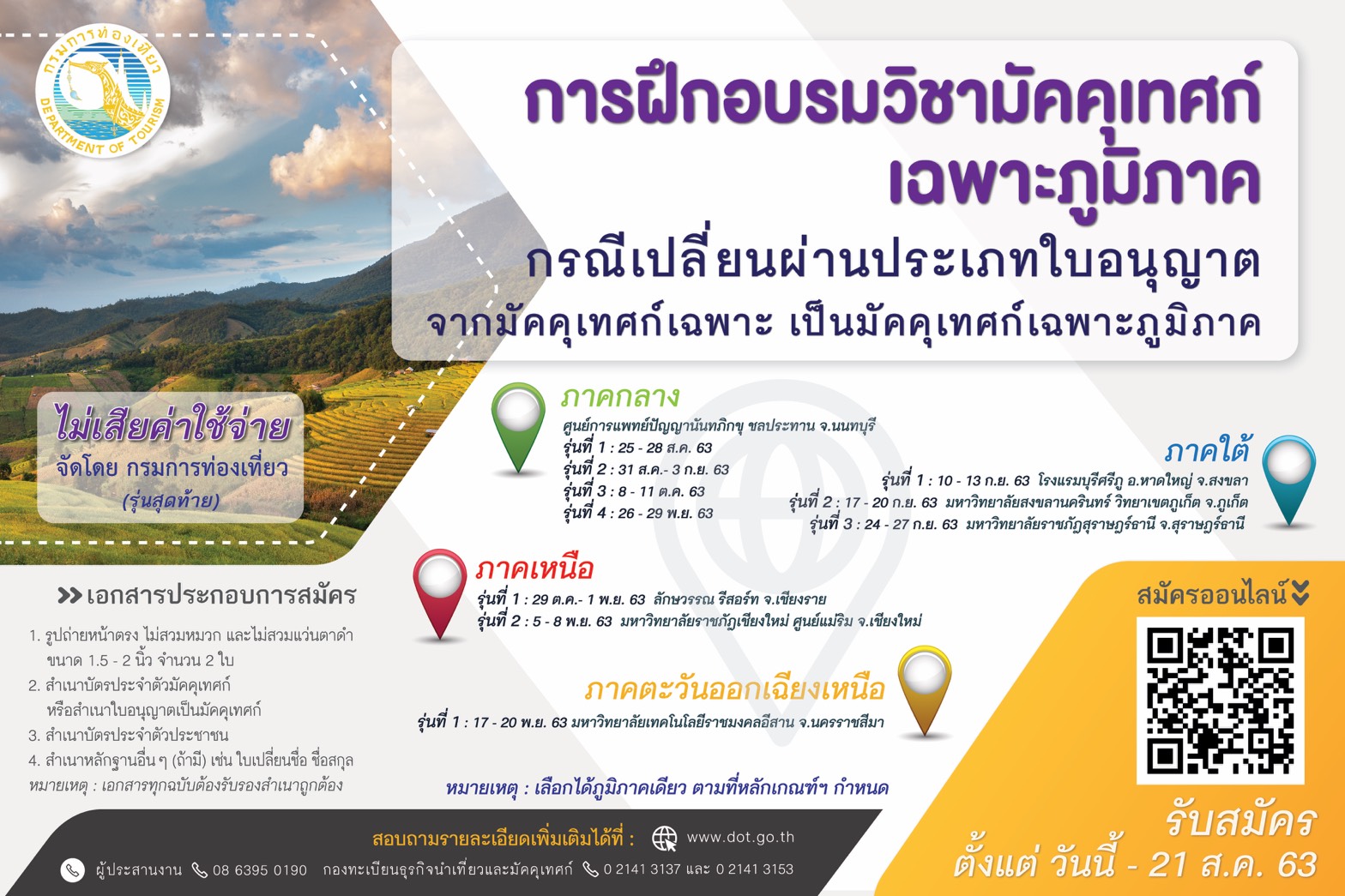 กรมการท่องเที่ยว กำหนดจัดการฝึกอบรมวิชามัคคุเทศก์เฉพาะภูมิภาค กรณีเปลี่ยนผ่านประเภทใบอนุญาตจากมัคคุเทศก์เฉพาะ เป็นมัคคุเทศก์เฉพาะภูมิภาค ประจำปี พ.ศ.2563 จำนวน 4 วัน รวม 27 ชั่วโมง โดยไม่เสียค่าใช้จ่ายเป็นปีสุดท้าย เพื่อเพิ่มความรู้ ทักษะ และความสามารถที่จำเป็นในการประกอบอาชีพของมัคคุเทศก์เพื่อรองรับการต่ออายุใบอนุญาตเป็นมัคคุเทศก์ ตามพระราชบัญญัติธุรกิจนำเที่ยวและมัคคุเทศก์ พ.ศ.2551 และที่แก้ไขเพิ่มเติม (ฉบับที่ 2) พ.ศ.2559 เปิดรับมัคคุเทศก์เฉพาะผู้มีใบอนุญาตทั่วประเทศ ใน 4 ภูมิภาค ซึ่งเป็นปีสุดท้ายที่กรมการท่องเที่ยวสนับสนุนงบประมาณในการจัดฝึกอบรม รายละเอียดการรับสมัครดังนี้