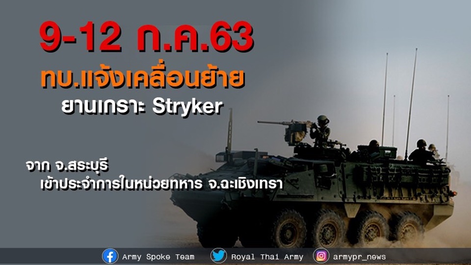 กองทัพบกโดย กองพลทหารราบที่ 11 จะทำการเคลื่อนย้ายยุทโธปกรณ์ และรถยานเกราะ Stryker จำนวน 14 คัน จาก กองพันซ่อมบำรุงเขตหลัง จ.สระบุรี เพื่อเข้าประจำการ ณ กรมทหารราบที่ 112 ค่ายสมเด็จพระนั่งเกล้า อ.เมือง จ.ฉะเชิงเทรา ระหว่าง 9-12 ก.ค.63 ตั้งแต่เวลา 09.00น. เป็นต้นไป โดยใช้เส้นทางจาก จ.สระบุรี ผ่าน อ.แก่งคอย เข้าสู่ถนนสุวรรณศร, ถนนหมายเลข 319, ถนนหมายเลข 304 ปลายทาง อ.เมือง จ.ฉะเชิงเทรา จึงขอแจ้งให้ประชาชนได้รับทราบและขออภัยในความไม่สะดวกด้านการจราจรที่เกิดขึ้นจากการเคลื่อนย้าย