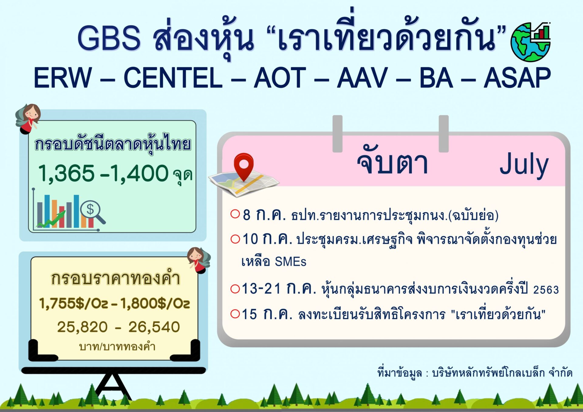 กรุงเทพฯ 8 ก.ค.- บล. โกลเบล็ก ประเมินสถานการณ์ตลาดหุ้นไทยมีโอกาสฟื้นตัวในลักษณะ Sideway ให้กรอบดัชนี 1,365-1,400 จุด พร้อมประเมินโครงการ“เราเที่ยวด้วยกัน” สามารถกระตุ้นการท่องเที่ยวในประเทศให้กลับมาครึกครื้น แนะ 6 หุ้น อานิสงส์เตรียมได้ประโยชน์แพ็กเกจ “เราเที่ยวด้วยกัน” ERW-CENTEL-AOT- AAV-BA –ASAP