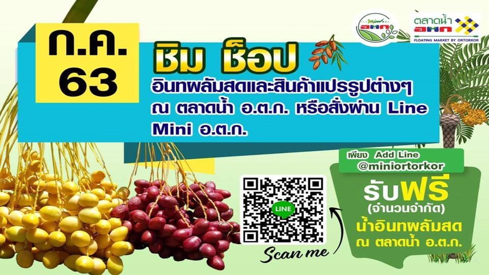 ทั้งนี้ ทาง อ.ต.ก.ได้เพิ่มช่องทางการจำหน่ายสินค้าออนไลน์ เพื่อเป็นการอำนวยความสะดวกในการให้บริการแก่ลูกค้า อ.ต.ก. สามารถสั่งซื้ออินทผลัมสดโดยตรงจากสวนของเกษตรกรระหว่างเดือนกรกฎาคม โดย Pre-order ผ่านทาง Line Mini อ.ต.ก. ได้อีกช่องทางหนึ่ง และฝากติดตามสินค้าเกษตรคุณภาพ ซึ่ง อ.ต.ก.คัดสรรมานำเสนอเพื่อส่งเสริมและพัฒนาเกษตรกรของไทย บน Platform Line Official Account และ Facebook Fanpage ภายใต้ชื่อ Mini อ.ต.ก.-สำนักข่าวไทย