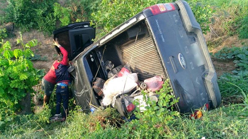 อุทัยธานี 9 ก.ค.- รถกระบะนั่งมา 5 คน เดินสายเยี่ยมญาติที่เชียงรายมาอุทัยธานีเสียหลักพลิกตะแคง หลังพุ่งชนเสาซุ้มประตูหักขวางกลางถนนทั้งสองฝั่ง บาดเจ็บ 2 คาดคนขับหลับใน