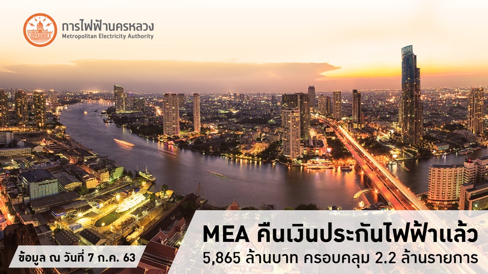 ตามที่การไฟฟ้านครหลวง หรือ MEA ได้เปิดให้ลงทะเบียนขอคืนเงินประกันการใช้ไฟฟ้าผ่านช่องทางออนไลน์ และหมายเลขโทรศัพท์ 0 2256 3333 ตั้งแต่วันที่ 25 มีนาคม 2563 เป็นต้นมานั้น ล่าสุดข้อมูล ณ วันที่ 7 กรกฎาคม 2563 มีผู้ได้รับเงินแล้วประมาณ 2.22 ล้านรายการ คิดเป็นจำนวนเงินกว่า 5,865 ล้านบาท