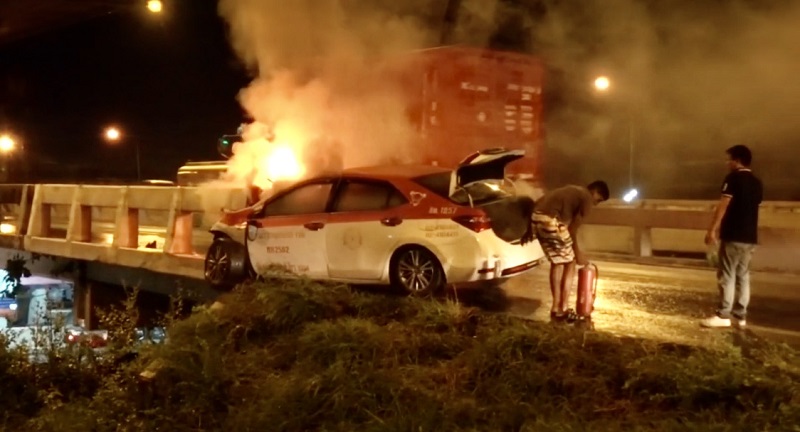 เมื่อเวลา 04.00 น. (10 ก.ค.) ร.ต.อ.ณชพล สังขะวิไล รองสว.(สอบสวน) สภ.บางปะกง จ.ฉะเชิงเทรา พร้อมหน่วยกู้ภัยฉะเชิงเทรา และรถดับเพลิงเทศบาลตำบลบางวัวคณารักษ์ เร่งช่วยเหลืออุบัติเหตุรถแท็กซี่ สีชมพู-ขาว ชนคอสะพานข้ามคลองสำโรง ถนนเทพรัตน (บางนา-ตราด) กม.42 ช่องทางด่วน ขาเข้าชลบุรี หมู่ 2 ต.บางสมัคร อ.บางปะกง และไฟลุกไหม้บริเวณห้องเครื่องยนต์ ส่วนคนขับและผู้โดยสารหญิง 2 คน ได้รับการช่วยเหลือออกมาได้ก่อนหน้านี้จากพลเมืองดีขณะขับรถจักรยานยนต์ผ่านมาพบว่าได้รับบาดเจ็บ เจ้าหน้าที่จึงนำส่งโรงพยาบาล