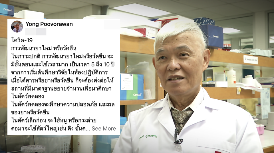 ศ.นพ.ยง ภู่วรวรรณ หัวหน้าศูนย์เชี่ยวชาญเฉพาะทางด้านไวรัสวิทยาคลินิก ภาควิชากุมารเวชศาสตร์ คณะแพทยศาสตร์ จุฬาลงกรณ์มหาวิทยาลัย โพสต์เฟซบุ๊ก Yong Poovorawan เรื่อง “โควิด-19 การพัฒนายาใหม่ หรือวัคซีน” ว่า ในภาวะปกติการพัฒนายาใหม่หรือวัคซีนจะมีขั้นตอนและใช้เวลามาก เป็นเวลา 5 ถึง 10 ปี จากการเริ่มต้นศึกษาวิจัยในห้องปฏิบัติการ เมื่อได้สารหรือยาหรือวัคซีน ก็จะต้องส่งต่อให้สถานที่มีมาตรฐานขยายจำนวนเพื่อมาศึกษาในสัตว์ทดลอง