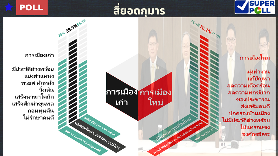 ผู้อำนวยการสำนักวิจัยซูเปอร์โพล กล่าวว่า ประชาชนกำลังหมดศรัทธาต่อพรรคการเมือง เพราะเห็นแต่ภาพการทรยศ หักหลัง เสร็จนาฆ่าโคถึก เสร็จศึกฆ่าขุนพล แย่งชิงตำแหน่ง จ้องจะถอนทุนคืน ในขณะที่ประชาชนกำลังเดือดร้อนทุกข์ยากผลกระทบจากวิกฤติเศรษฐกิจ ตกงาน ขาดรายได้ แต่นักการเมืองมุ่งแต่จะหาประโยชน์ส่วนตัวและพวกพ้อง ไม่ได้เป็นแบบอย่างที่ดีต่อเด็กและเยาวชนคนรุ่นใหม่ จึงเสนอให้นำความต้องการของประชาชนเป็นตัวตั้งและทำงานตอบโจทย์ตรงเป้าความต้องการของประชาชนที่ไม่ต้องการเห็นความวุ่นวาย ความขัดแย้งแย่งชิงตำแหน่งรัฐมนตรีที่กำลังยึดครองพื้นที่สื่อข้อมูลข่าวสารในเวลานี้