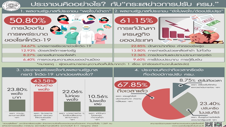 สวนดุสิตโพลวิเคราะห์ว่าในภาพรวมประชาชนพอใจต่อการควบคุมสถานการณ์โควิดของรัฐบาล แต่ยังไม่พอใจในการแก้ปัญหาเศรษฐกิจเท่าใดนัก อยากให้มีการปรับ ครม. เพราะหลายกระทรวงยังไม่เห็นผลงานที่เด่นชัด โดยเฉพาะอย่างยิ่งกระทรวงด้านเศรษฐกิจที่อยู่ภายใต้การดูแลของพรรคพลังประชารัฐที่นับวันก็จะถูกโจมตีอย่างต่อเนื่องว่ายังไม่สามารถแก้ปัญหาเศรษฐกิจของประเทศได้ ยิ่งไปกว่านั้นในช่วงสัปดาห์ที่ผ่านมาปัญหาภายในพรรคพลังประชารัฐยังกระทบต่อการบริหารงานของรัฐบาล จนทำให้ต้องยกเลิกการประชุมแก้ปัญหาเศรษฐกิจ หลายฝ่ายจึงจับตามองว่าการปรับ ครม. ที่กำลังจะเกิดขึ้นนี้น่าจะกระทบต่อโควต้าของพรรคพลังประชารัฐอย่างแน่นอน และเป็นการปรับ ครม. ที่ประชาชนคาดหวังว่าจะมีการเปลี่ยนทีมเศรษฐกิจโดยใช้ผู้มีประสบการณ์ตรงทั้งนักการเมืองและคนนอกเข้ามาทำงานเพื่อแก้ปัญหาของประเทศ.-สำนักข่าวไทย