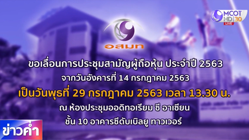 อสมท 12 ก.ค. – บมจ.อสมท ขอเลื่อนการประชุมสามัญผู้ถือหุ้น ประจำปี 2563 จากวันอังคารที่ 14 กรกฎาคม 2563 เป็นวันพุธที่ 29 กรกฎาคม 2563 เวลา 13.30 น. ณ ห้องประชุมออดิทอเรียม ซี อาเซียน ชั้น 10 อาคารซีดับเบิลยู ทาวเวอร์ โดยเปิดให้ผู้ถือหุ้นลงทะเบียนเข้าร่วมประชุมได้ตั้งแต่เวลา 10.00 น. ทั้งนี้ จำกัดจำนวนผู้เข้าประชุม และงดแจกอาหาร เพื่อความปลอดภัยตามมาตรการควบคุมโรค. – สำนักข่าวไทย
