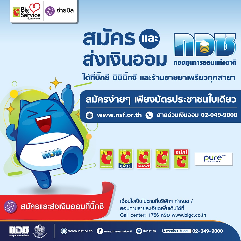 กรุงเทพฯ 13 ก.ค. – กอช.เพิ่มจุดบริการรับสมัครสมาชิกและส่งเงินออมสะสม ที่จุดบริการบิ๊กเซอร์วิสในบิ๊กซีทุกสาขาทั่วประเทศ ฟรีค่าธรรมเนียม ถึง 31 ก.ค.นี้