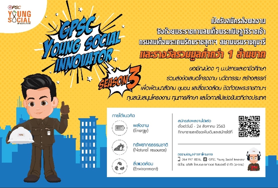 บริษัท โกลบอล เพาเวอร์ ซินเนอร์ยี่ จำกัด (มหาชน) หรือ GPSC แกนนำนวัตกรรมธุรกิจไฟฟ้ากลุ่ม ปตท. แจ้งว่า ได้จัดโครงการประกวด GPSC Young Social Innovator 2020 ภายใต้แนวคิด “พลังงาน ทรัพยากรธรรมชาติ และสิ่งแวดล้อมที่ยั่งยืน: Sustainable Energy, Natural Resources and Environment” ต่อเนื่องเป็นปีที่ 3 เพื่อเปิดโอกาสให้นักเรียนในระดับมัธยมศึกษาตอนปลาย และอาชีวศึกษา (ปวช.) หรือเทียบเท่าจากทั่วประเทศ ร่วมส่งโครงงานนวัตกรรมสิ่งประดิษฐ์ ด้านพลังงาน และด้านการใช้ทรัพยากรธรรมชาติและสิ่งแวดล้อม ชิงถ้วยพระราชทาน สมเด็จพระกนิษฐาธิราชเจ้า กรมสมเด็จพระเทพรัตนราชสุดาฯ สยามบรมราชกุมารี ทุนพัฒนาผลงานทุนการศึกษา และโอกาสไปแข่งขันในเวทีระดับนานาชาติ