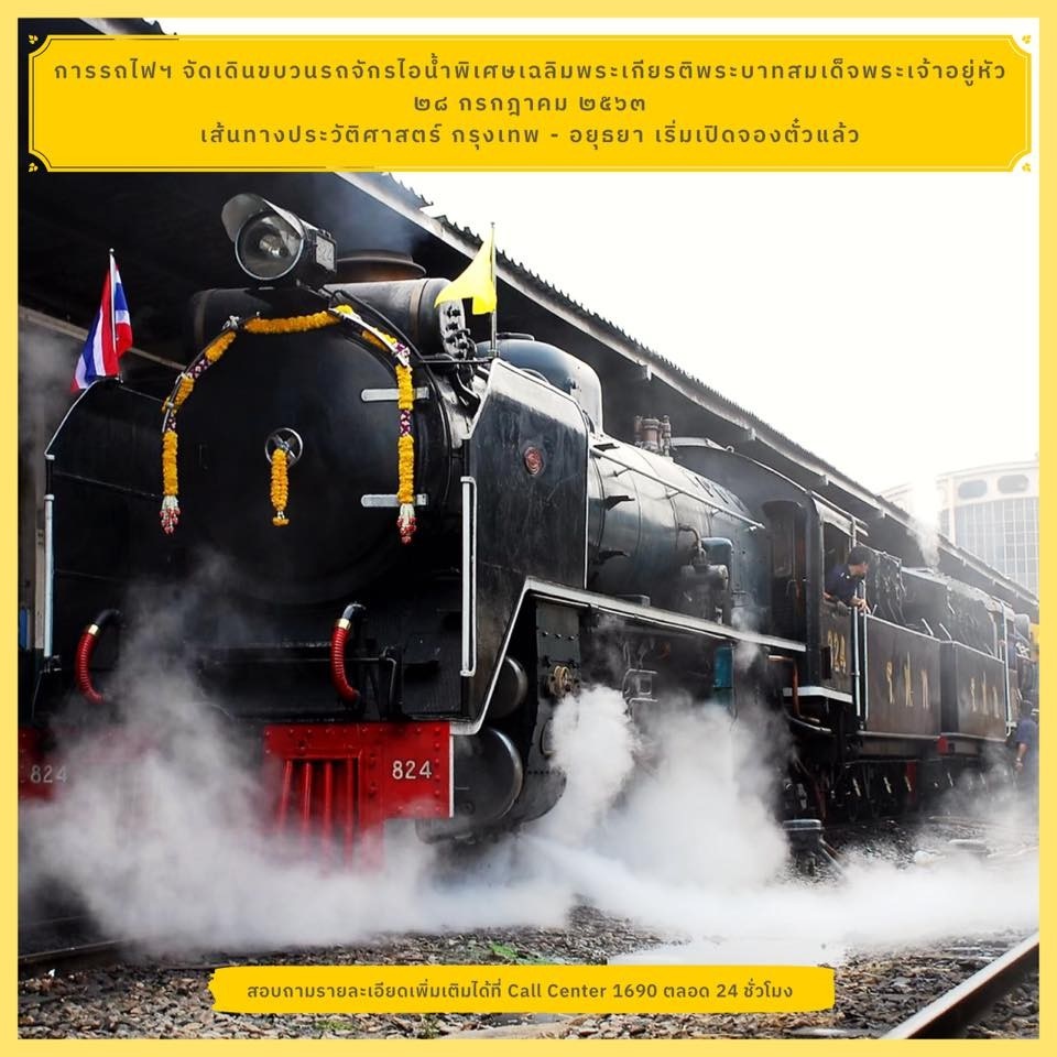 ในโอกาสนี้การรถไฟฯ ได้นำขบวนรถจักรไอน้ำประวัติศาสตร์รถจักรไอน้ำแบบแปซิฟิก หมายเลข 824 และ 850 รุ่นหลังสงครามโลกครั้งที่ 2 ผลิตโดยบริษัท นิปปอน ชาร์เรียว ซึ่งปัจจุบันเก็บรักษาและซ่อมบำรุงอยู่ที่โรงรถจักรธนบุรีมาจัดเดินขบวนรถพิเศษนำเที่ยวในเส้นทางสายประวัติศาสตร์ระหว่างสถานีกรุงเทพฯ ถึงสถานีอยุธยา เพื่อให้ประชาชนได้มีส่วนร่วมในการเฉลิมพระเกียรติพระบาทสมเด็จพระเจ้าอยู่หัวผ่านกิจกรรมครั้งนี้ ทั้งนี้ ขบวนรถจักรไอน้ำพิเศษนำเที่ยวเส้นทางกรุงเทพฯ – อยุธยา – กรุงเทพฯ ขบวนที่ 901/902 จะออกจากสถานีกรุงเทพ (หัวลำโพง) วันที่ 28 กรกฎาคม 2563 เวลา 08.10 น. ถึงสถานีอยุธยา เวลา 10.15 น. ซึ่งนักท่องเที่ยวสามารถเดินทางท่องเที่ยวภายในจังหวัดพระนครศรีอยุธยา ประมาณ 6 ชั่วโมง และเที่ยวกลับออกจากสถานีอยุธยา เวลา 16.40 น. ถึงกรุงเทพฯ เวลา 18.45 น. โดยมีสถานีที่หยุดรับ – ส่งผู้โดยสาร ได้แก่ สถานีสามเสน บางซื่อ บางเขน หลักสี่ ดอนเมือง รังสิต สำหรับนักท่องเที่ยวสามารถขึ้นหรือลงตามสถานีดังกล่าว ส่วนประชาชนทั่วไปที่อาศัยอยู่ใกล้เส้นทางรถไฟสายกรุงเทพฯ – อยุธยา ที่ไม่มีโอกาสเดินทางไปกับขบวนรถพิเศษ สามารถร่วมบันทึกภาพหัวรถจักรไอน้ำในเส้นทางที่ขบวนรถวิ่งผ่านได้
