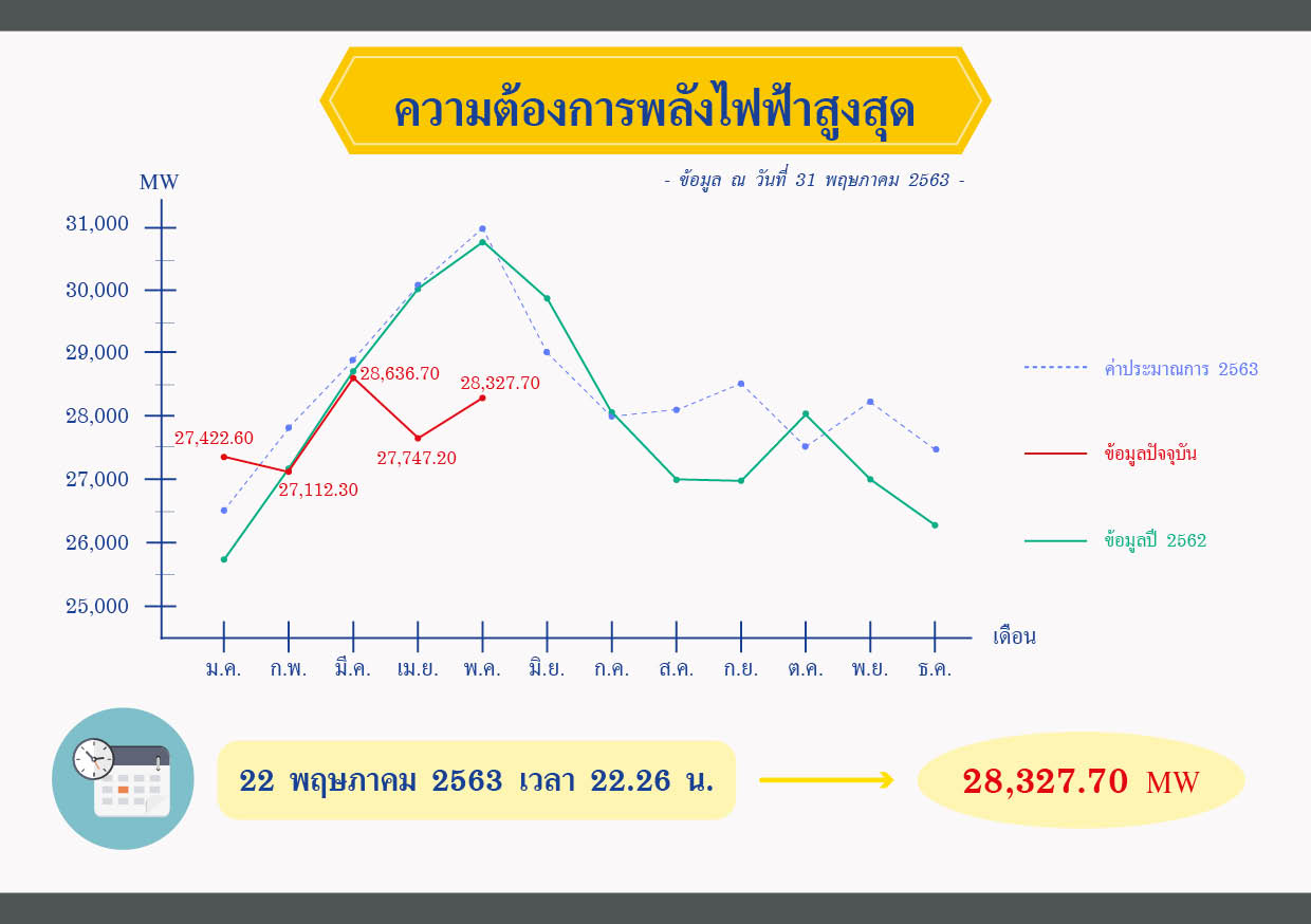 นายพัฒนา แสงศรีโรจน์ รองผู้ว่าการยุทธศาสตร์ การไฟฟ้าฝ่ายผลิตแห่งประเทศไทย(กฟผ.) และโฆษก กฟผ. กล่าวว่า ในขณะนี้ กฟผ.ติดตามสถานการณ์การใช้ไฟฟ้าของประเทศ ซึ่งพบว่า ยอดการใช้ได้ลดลงตามภาวะเศรษฐกิจที่ได้รับผลกระทบจากสถานการณ์ระบาดโรค โควิด-19 โดยเดือนพฤษภาคมลดลงต่ำที่สุดที่ประมาณติดลบร้อยละ 10 เดือนเมษายนติดลบร้อยละ 9 ส่วนเดือนมิถุนายนเริ่มคลายล็อกดาวน์ยอดใช้ได้กลับมาเพิ่มขึ้น แต่ยังคงติดลบราวร้อยละ 8 เมื่อเปรียบเทียบกับช่วงเดียวกันของปีก่อน ซึ่งปกติแล้วยอดการใช้ไฟฟ้าของประเทศ จะเทียบเท่า ยอดอัตราการขยายตัวทางเศรษฐกิจของประเทศ ดังนั้น หากเศรษฐกิจของประเทศ มีอัตราติดลบร้อยละ 8.1 ตามที่ธนาคารแห่งประเทศไทย (ธปท.) คาดการณ์ ดังนั้น ก็มีโอกาสที่ ความต้องการใช้ไฟฟ้าของประเทศปีนี้จะติดลบร้อยละ 8.1 เท่ากัน
