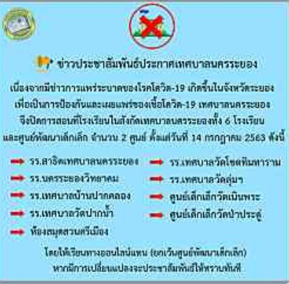 นายฉัตรนุชัย สมบัติศรี ปลัดเทศบาลนครระยอง เปิดเผยว่า นายวรวิทย์ ศุภโชคชัย นายกเทศมนตรีนครระยอง ออกประกาศเทศบาลฯ เนื่องจากขณะนี้มีข่าวโควิด-19 เกิดขึ้นในพื้นที่ ดังนั้น เพื่อเป็นการป้องกันการระบาดของโรค จึงปิดการเรียนการสอนของโรงเรียนในสังกัดเทศบาลนครระยองทั้ง 6 แห่ง 2 ศูนย์พัฒนาเด็กเล็ก กับอีก 1 ห้องสมุดประชาชน นับตั้งแต่วันที่ 14 ก.ค.2563 เป็นต้นไป ประกอบด้วยโรงเรียนสาธิตเทศบาลนครระยอง โรงเรียนนครระยองวิทยาคม โรงเรียนเทศบาลบ้านปากคลอง โรงเรียนเทศบาลวัดปากน้ำ โรงเรียนเทศบาลวัดโขดทิมทาราม โรงเรียนเทศบาลวัดลุ่ม ซึ่งทั้งหมดนี้ให้เรียนออนไลน์แทน ยกเว้นศูนย์เด็กเล็กวัดเนินพระ ศูนย์เด็กเล็กวัดป่าประดู่ และห้องสมุดประชาชนสวนศรีเมืองให้ปิดไปก่อน อีกทั้งคืนนี้เทศบาลนครระยองร่วมกับนายสมชาย รุ่งเรือง ท้องถิ่นจังหวัดระยอง และนายสุพจน์ ต่ออาจหาญ นายอำเภอเมือง นำชุดเจ้าหน้าที่และรถปฏิบัติการฉีดล้างทำความสะอาดฆ่าเชื้อตามที่สาธารณะ ทางเดินเท้า และถนนสุขุมวิท เริ่มตั้งแต่โฮมโปร ระยอง ไปย่านแพชชั่น ช้อปปิ้ง (ห้างแหลมทอง) ย่านโรงแรมดิวารี จนถึงแยกระยองซิตี้