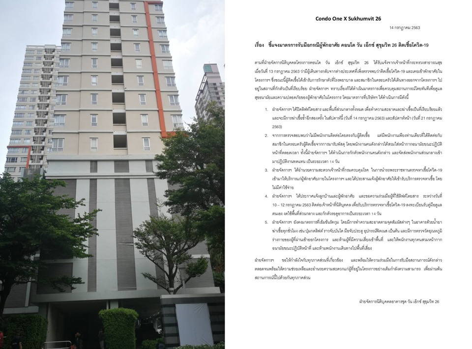 ฝ่ายจัดการนิติบุคคลอาคารชุดวัน เอ็กซ์ สุขุมวิท 26 ชี้แจงมาตรการรับมือกรณีผู้พักอาศัยคอนโด วัน เอ็กซ์ สุขุมวิท 26 ติดเชื้อโควิด-19 ว่า ตามที่ฝ่ายจัดการนิติบุคคลโครงการคอนโดวัน เอ็กซ์ สุขุมวิท 26 ได้รับแจ้งจากเจ้าหน้าที่กระทรวงสาธารณสุข เมื่อวันที่ 13 กรกฎาคม 2563 ว่ามีผู้เดินทางกลับจากต่างประเทศที่เพิ่งตรวจพบว่าติดเชื้อโควิด-19 และเคยเข้าพักอาศัยในโครงการฯ ซึ่งขณะนี้ผู้ติดเชื้อได้เข้ารับการรักษาตัวที่โรงพยาบาล และสมาชิกในครอบครัวได้เดินทางออกจากโครงการฯ ไปอยู่ในสถานที่กักตัวเป็นที่เรียบร้อย ฝ่ายจัดการฯ ทราบเรื่องก็ได้ดำเนินมาตรการเพื่อควบคุมสถานการณ์โดยทันที เพื่อดูแลสุขอนามัยและความปลอดภัยของผู้พักอาศัยในโครงการ โดยมาตรการที่บริษัทฯ ได้ดำเนินการมีดังนี้ 1.ฝ่ายจัดการฯ ได้ปิดลิฟท์โดยสาร และพื้นที่ส่วนกลางทั้งหมด เพื่อทำความสะอาดและฆ่าเชื้อเป็นที่เรียบร้อยแล้ว และจะมีการฆ่าเชื้อซ้ำอีก 2 ครั้ง ในสัปดาห์นี้ (วันที่ 14 กรกฏาคม 2563) และสัปดาห์หน้า (วันที่ 21 กรกฏาคม 2563)