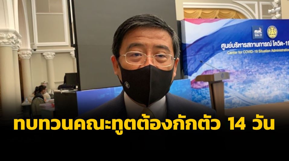 ทำเนียบรัฐบาล 14 ก.ค.-โฆษก กต.เผยเสนอ ศบค.ชุดเล็กทบทวนมาตรการให้คณะทูตต้องเข้ากักตัวในสถานที่รัฐจัดให้ 14 วันพร้อมเสียค่าใช้จ่ายเอง ยกเลิก 8 เที่ยวบินทหารอียิปต์ที่ขอเข้าไทย