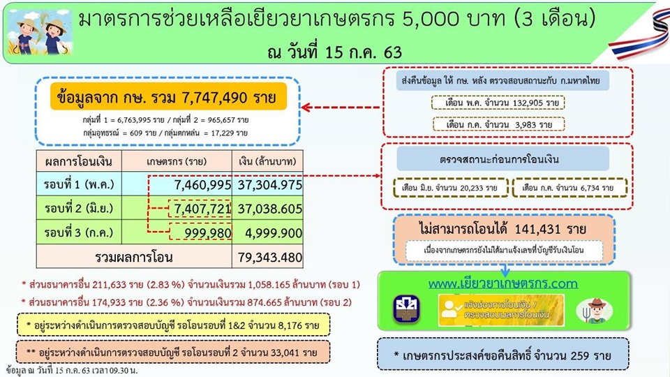 ทั้งนี้ ขณะนี้มีรายชื่อเกษตรกรที่อยู่ในขั้นตอนตรวจสอบสถานะทางทะเบียนราษฎร์ก่อนโอนเงินงวดเดือนมิถุนายน 20,233 รายและงวดเดือนกรกฎาคม 6,734 ราย ส่วนที่ตรวจสอบสถานะแล้วและอยู่ระหว่างการตรวจสอบความถูกต้องของเลขบัญช๊ 41,217 ราย ส่วนที่ยังไม่สามารถโอนเงินให้ได้เนื่องจากเกษตรกรยังไม่ได้แจ้งเลขบัญชี 141,431 รายซึ่งธ.ก.ส. ขอให้แจ้งผ่าน www.เยียวยาเกษตรกร.com ภายใยวันที่ 25 กรกฎาคมนี้