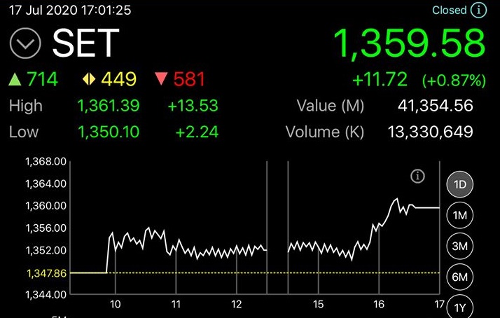 ตลาดหลักทรัพย์แห่งประเทศไทย 17 ก.ค. – ตลาดหลักทรัพย์ ปิดวันนี้ที่ระดับ 1,359.58 จุด เพิ่มขึ้น 11.72 จุด (+0.87%) มูลค่าการซื้อขาย 41,354.56 ล้านบาท