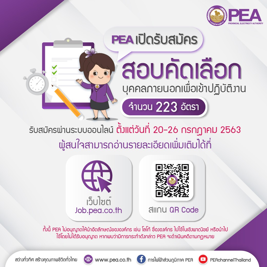 สำนักข่าวไทย 18 ก.ค. 63 – การไฟฟ้าส่วนภูมิภาคเปิดรับสมัครคัดเลือกบุคคลภายนอกเพื่อเข้าปฏิบัติงานในพื้นที่ของการไฟฟ้าส่วนภูมิภาคทั่วประเทศ จำนวน 223 อัตรา โดยจะเปิดรับสมัครผ่านระบบออนไลน์ ตั้งแต่วันที่ 20-26 กรกฎาคม 2563 (ไม่เว้นวันหยุดราชการ) ผู้สนใจสามารถศึกษารายละเอียดได้ทางเว็บไซต์ https://