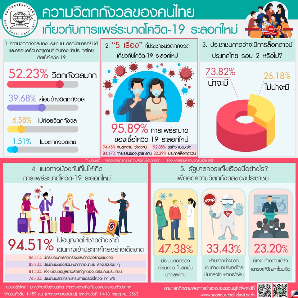 “สวนดุสิตโพล” มหาวิทยาลัยสวนดุสิต สำรวจความคิดเห็นประชาชนทั่วประเทศ จำนวน 1,459 ตัวอย่าง ผ่านทางออนไลน์ ระหว่างวันที่ 14-18 ก.ค.63 เรื่องความวิตกกังวลของคนไทย เกี่ยวกับการแพร่ระบาดโควิด-19 ระลอกใหม่ สืบเนื่องจากกรณีทหารอียิปต์และครอบครัวชาวซูดานที่เดินทางเข้าประเทศไทยติดเชื้อโควิด-19 ส่งผลให้คนไทยเกิดความวิตกกังวลว่าจะนำมา ซึ่งการแพร่ระบาดของเชื้อโควิด-19 ระลอกใหม่อีกครั้ง ขณะที่กระแสข่าวล็อกดาวน์ประเทศรอบสองเป็นเรื่องที่ถูกจับตามองว่ารัฐบาลจะประเมินสถานการณ์ไปในทิศทางใด เพื่อสะท้อนความคิดเห็นของประชาชน