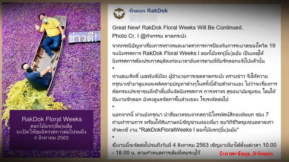 สำนักข่าวไทย 19 ก.ค.-หลังก่อนหน้านี้มีการประกาศเตรียมพิจารณายุติการจัดงาน RakDok Floral Weeks เนื่องจากมีคนแห่ไปถ่ายรูปกับดอกไม้จำนวนมาก จนเกิดความกังวลเรื่องมาตรการป้องกันโรคโควิด-19 ล่าสุดผู้จัดงานโพสต์เฟซบุ๊กแจ้งว่างานจะจัดต่อไปจนถึง 4ส.ค.นี้ ภายใต้มาตรการป้องโรคอย่างเข้มข้น