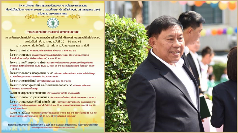 พล.ต.อ.อัศวิน ขวัญเมือง ผู้ว่าราชการกรุงเทพมหานคร (ผู้ว่าฯกทม.)โพสต์เฟซบุ๊ก “ผู้ว่าฯอัศวิน” ว่า “ตรวจก่อน รู้ก่อน ป้องกันได้ โรงพยาบาล11 แห่งในสังกัด กทม.ร่วมกันจัดกิจกรรมเนื่องในโอกาสวันเฉลิมพระชนมพรรษาพระบาทสมเด็จพระวชิรเกล้าเจ้าอยู่หัว 28 กรกฎาคม 2563