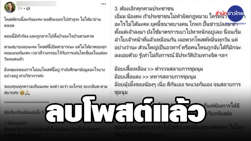 อย่างไรก็ตาม พ.อ.หญิง นุสรา ได้ลบโพสต์ดังกล่าวไปแล้ว .- สำนักข่าวไทย