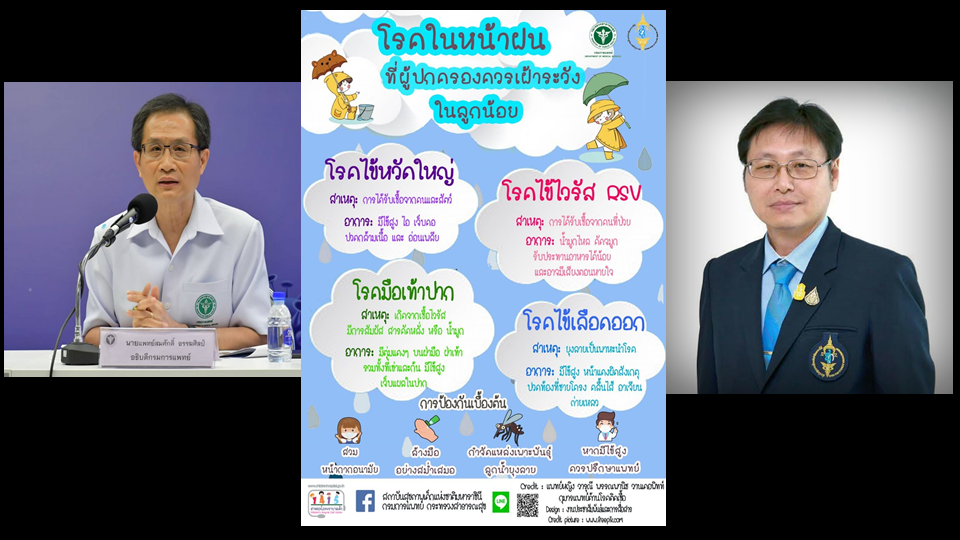นพ.สมศักดิ์ อรรฆศิลป์ อธิบดีกรมการแพทย์ กระทรวงสาธารณสุข (สธ.)เปิดเผยว่า โรคที่พบบ่อยในช่วงฤดูฝนส่วนมากมักเป็นโรคที่เกี่ยวกับทางเดินหายใจ เช่น โรคไข้หวัด, ไข้หวัดใหญ่, ไข้ไวรัส RSV, ปอดบวม, หลอดลมอักเสบ และมือเท้าปากสาเหตุมาจากการได้รับเชื้อมาจากคนและสัตว์
