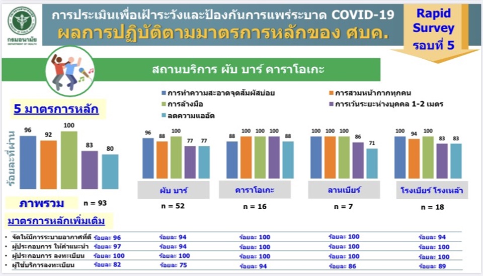 นพ.บัญชา ค้าของ รองอธิบดีกรมอนามัย กระทรวงสาธารณสุข (สธ.) กล่าวว่า จากการประเมินเพื่อการเฝ้าระวังและป้องกันการแพร่ระบาดโรคโควิด-19 สำหรับกิจกรรม/กิจการที่ได้รับการผ่อนคลาย ระยะที่ 5 สำรวจระหว่างวันที่ 13-16 กรกฎาคม 2563 ใน 3 กิจการ โดยสำรวจการปฏิบัติตามมาตรการหลักของศูนย์บริหารสถานการณ์แพร่ระบาดของโรคติดเชื้อไวรัสโคโรนา 2019 (ศบค.) ใน 5 ด้าน คือ การทำความสะอาดจุดสัมผัสบ่อย การสวมหน้ากาก มีจุดบริการล้างมือ/เจลแอลกอฮอล์ การเว้นระยะห่างระหว่างบุคคล และการลดความแออัด พบว่าภาพรวมได้รับความร่วมมือและมีการปฏิบัติตามมาตรการหลักในระดับดี โดยสถานบริการประเภทผับ บาร์ คาราโอเกะ ลานเบียร์ โรงเบียร์ โรงเหล้า