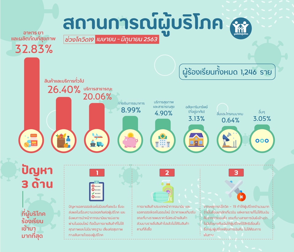 เมื่อดูรายละเอียดของเรื่องร้องเรียน พบว่าหมวดอาหาร ยา และผลิตภัณฑ์สุขภาพ (409 เรื่อง) ปัญหาที่พบส่วนใหญ่จะเป็นการร้องเรียนเรื่องเจลแอลกอฮอล์ที่ไม่มีเลข อย. และการนำหน้ากากอนามัยมาแพ็คแบ่งขายผ่านออนไลน์ นับเป็นการขายสินค้าที่ไม่ได้คุณภาพมาตรฐาน เสี่ยงต่อสุขภาพทางเดินหายใจของผู้บริโภค