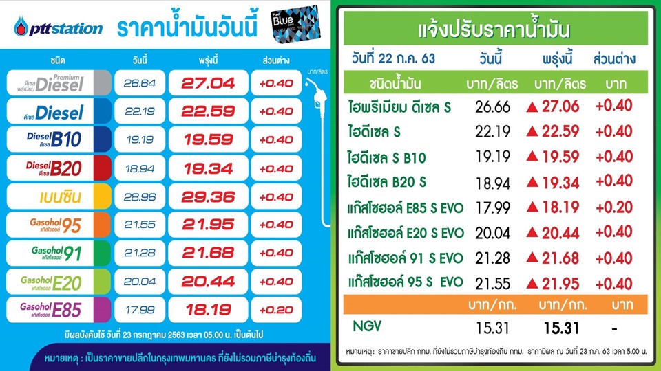 กรุงเทพฯ 22 ก.ค. – ปตท.-บางจากฯ ปรับราคาน้ำมันทุกชนิดขึ้น 40 สต. ยกเว้น E85 เพิ่มขึ้น 20 สต. มีผล 23 ก.ค.