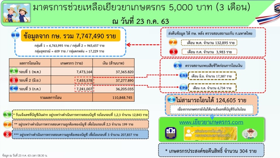 นายกษาปณ์ เงินรวง รองผู้จัดการ ธนาคารเพื่อการเกษตรและสหกรณ์การเกษตร (ธ.ก.ส.) กล่าวว่า วันนี้ (23 ก.ค.) ธ.ก.ส.โอนเงินเยียวยางวด 3 เดือนกรกฎาคมให้เกษตรกรเพิ่มอีก 14,376 ราย ซึ่งเป็นการโอนเข้าบัญชีต่างธนาคาร เกษตรกรจะเบิกเงินได้ในวันพรุ่งนี้ (24 ก.ค.) รวมผลการโอนเงินเยียวยางวด 3 ทั้งสิ้น 7,241,007 ราย ครบตามรายชื่อที่กระทรวงเกษตรและสหกรณ์ส่งมา ยกเว้นผู้เสียชีวิต โดย ธ.ก.ส.โอนเงินงวดที่ 1 ตั้งแต่วันที่ 15 พฤษภาคม ก่อนจะโอนเงินงวดที่ 2 ของเดือนมิถุนายน ได้ตรวจสอบสถานะทางทะเบียนราษฎร์ของเกษตรกรพบว่า มีผู้เสียชีวิต 17,387 ราย และก่อนโอนเงินงวดที่ 3 ของเดือนกรกฎาคม ได้ตรวจสอบพบว่า มีผู้เสียชีวิต 6,734 ราย ซึ่ง ธ.ก.ส.ส่งรายชื่อคืนกระทรวงเกษตรฯ เพื่อดำเนินการตามขั้นตอนต่อไป สำหรับเกษตรกรที่มีสิทธิ์รับเงินเยียวยา แต่ยังไม่ได้แจ้งเลขบัญชีมายัง ธ.ก.ส. 124,605 รายซึ่งขอให้แจ้งผ่าน www.เยียวยาเกษตรกร.com ภายในวันที่ 25 กรกฎาคม เพื่อ ธ.ก.ส.จะสามารถโอนเงินทั้ง 3 งวดให้ได้ทันในสิ้นเดือนนี้ หากแจ้งหลังจากที่กำหนด ทางกระทรวงเกษตรและสหกรณ์รวบรวมราย สำหรับผู้แจ้งสละสิทธิ์มี 304 ราย