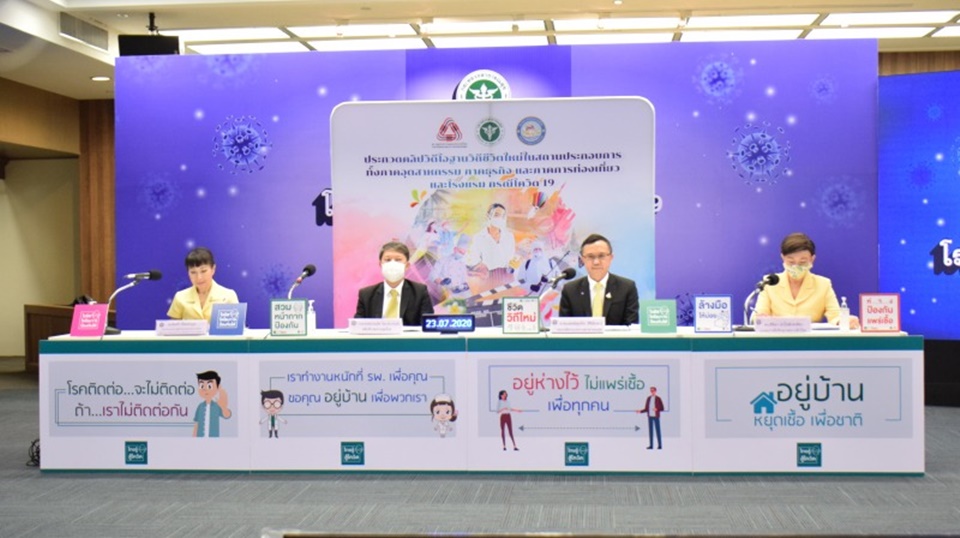 วันนี้ (23 ก.ค.) ที่ศูนย์ปฏิบัติการด้านข่าวโรคติดเชื้อไวรัสโคโรนา 2019 กระทรวงสาธารณสุข นพ.ศุภกิจ ศิริลักษณ์ รองปลัดกระทรวงสาธารณสุข พร้อมด้วย นพ.สุวรรณชัย วัฒนายิ่งเจริญชัย อธิบดีกรมควบคุมโรค นางศิรินา ปวโรฬารวิทยา กรรมการที่ปรึกษาหอการค้าไทย และนางพิมพ์ใจ ลี้อิสสระนุกูล รองประธานสภาอุตสาหกรรมแห่งประเทศไทย และประธานคณะอนุกรรมการป้องกันการระบาดโควิด 19 ร่วมแถลงข่าว โครงการสุขภาวะของคนทำงานด้วย Healthy Living และการประกวดคลิปวิดีโอฐานวิถีชีวิตใหม่ ในสถานประกอบการภาคอุตสาหกรรม ภาคธุรกิจ ภาคการท่องเที่ยวและโรงแรม กรณีโควิด-19