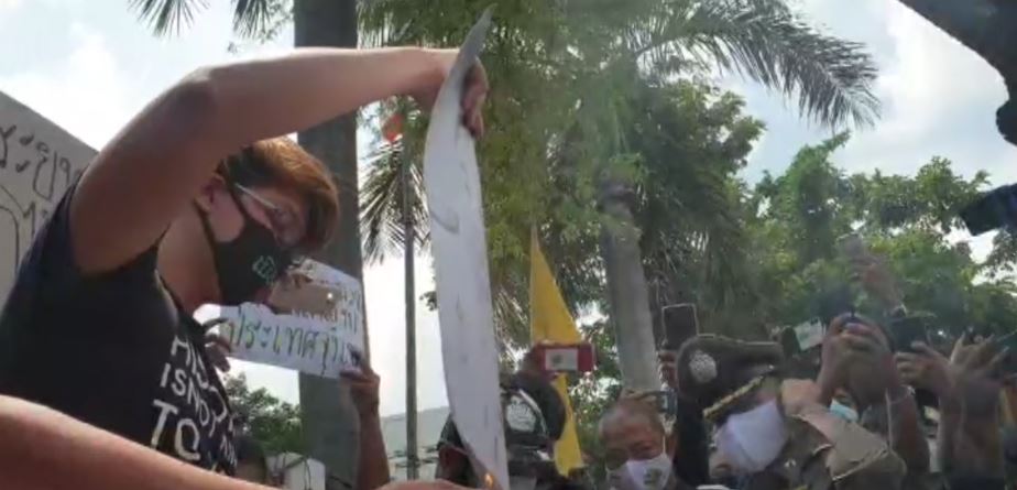 The protesters torched the photos of Prayut and Deputy Prime