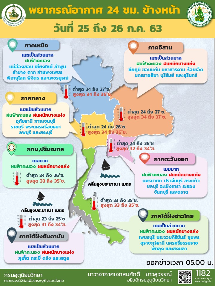 กรมอุตุฯ พยากรณ์อากาศ 24 ชม.ข้างหน้า ภาคตะวันออก ภาคกลาง และภาคใต้ มีฝนตกหนักบางแห่ง รวมถึง กทม.-ปริมณฑล โดยมีฝนฟ้าคะนอง 60% ของพื้นที่ ช่วงวันที่ 27-30 ก.ค.63 ประเทศไทยจะมีฝนเพิ่มมากขึ้น และมีฝนตกหนักบางแห่งเกือบทุกภาค ยกเว้นภาคอีสาน