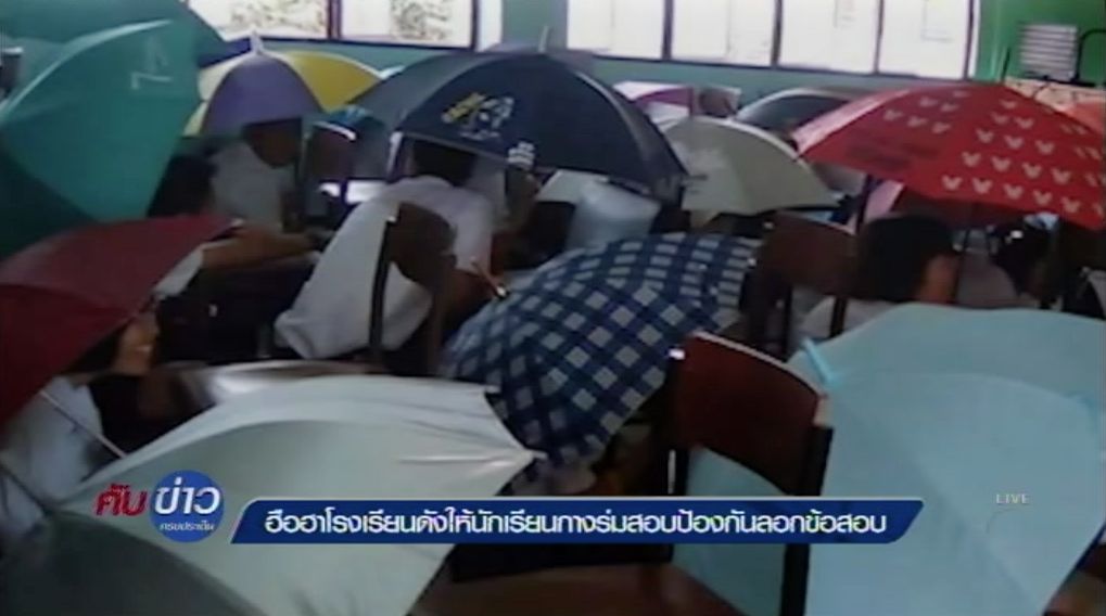 สังคมออนไลน์แชร์ภาพของโรงเรียนชั้นมัธยมชื่อดังแห่งหนึ่งใน อ.หาดใหญ่ ที่ให้นักเรียนกางร่มสอบในห้องเรียน เพื่อป้องกันการลอกข้อสอบซึ่งบรรยากาศในภาพนอกจากจะกางร่มแล้วยังให้นักเรียนนั่งบนพื้นและใช้เก้าอี้แทนโต๊ะ โดยนักเรียนทั้งชายและหญิงต่างยิ้มแย้มไม่ได้เคร่งเครียดกับการสอบ ซึ่งแตกต่างจากการสอบทั่วๆ ไป และมีครูผู้ชายยืนอยู่หน้าห้องเรียนคอยพูดให้นักเรียนฟังซึ่งมีท่าทางอารมณ์ดีเช่นกัน หลังจากภาพนักเรียนกางร่มสอบถูกนำไปเผยแพร่ในสื่อสังคมออนไลน์ได้มีผู้เข้ามาแสดงความคิดเห็นส่วนใหญ่มองว่าเป็นเรื่องที่ดีและน่ารักและชื่มชมความคิดของครู แต่อีกบางส่วนมองว่าแม้จะใช้วิธีนี้แต่ก็ไม่น่าจะป้องกันนักเรียนลอกข้อสอบได้
