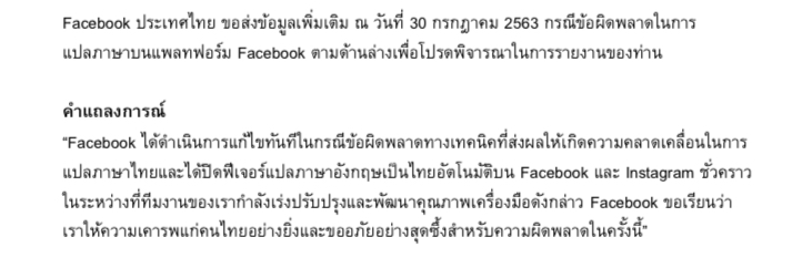 เฟซบุ๊ก ประเทศไทย ออกคำแถลงการณ์ กรณีข้อผิดพลาดในการแปลภาษาบนแพลตฟอร์มดังนี้ Facebook ได้ดำเนินการแก้ไขทันทีในกรณีข้อผิดพลาดทางเทคนิคที่ส่งผลให้เกิดความคลาดเคลื่อนในการแปลภาษาไทยและได้ปิดฟีเจอร์แปลภาษาอังกฤษเป็นไทยอัตโนมัติบน Facebook และ Instagram ชั่วคราว ในระหว่างที่ทีมงานของเรากำลังเร่งปรับปรุงและพัฒนาคุณภาพเครื่องมือดังกล่าว Facebook ขอเรียนว่าเราให้ความเคารพแก่คนไทยอย่างยิ่งและขออภัยอย่างสุดซึ้งสำหรับความผิดพลาดในครั้งนี้-สำนักข่าวไทย.