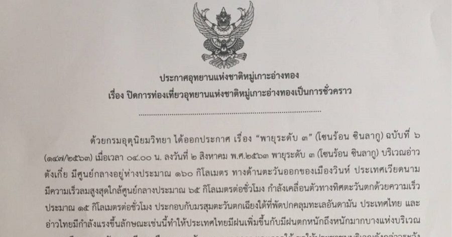 นายปิยะ หนูนิล หัวหน้าอุทยานแห่งชาติหมู่เกาะอ่างทอง จ.สุราษฎร์ธานี ประกาศปิดการท่องเที่ยวอุทยานแห่งชาติหมู่เกาะอ่างทองเป็นการชั่วคราว ตั้งแต่วันที่ 2-5 สิงหาคม 2563 เนื่องจากกรมอุตุนิยมวิทยาแจ้งเตือนเรื่อง “พายุระดับ 3” (โซนร้อน ซินลากู) บริเวณอ่าวตังเกี๋ย ประเทศเวียดนาม ประกอบกับมรสุมตะวันตกเฉียงใต้ที่พัดปกคลุมทะเลอันดามัน ประเทศไทย และอ่าวไทยมีกำลังแรงขึ้น ลักษณะเช่นนี้ทำให้ประเทศไทยมีฝนเพิ่มขึ้นกับมีฝนตกหนักถึงหนักมากบางแห่งบริเวณภาคเหนือ ภาคตะวันออกเฉียง เหนือ ภาคตะวันออก ภาคกลาง และภาคใต้ ซึ่งอาจทำให้เกิดน้ำท่วมฉับพลันและน้ำป่าไหลหลากได้ จึงขอปิดการท่องเที่ยวในเขตอุทยานแห่ชาติหมู่เกาะอ่างทองเป็นการชั่วคราว เพื่อความปลอดภัยต่อชีวิตและทรัพย์สินของนักท่องเที่ยวและอันตรายที่อาจเกิดขึ้นได้.-สำนักข่าวไทย