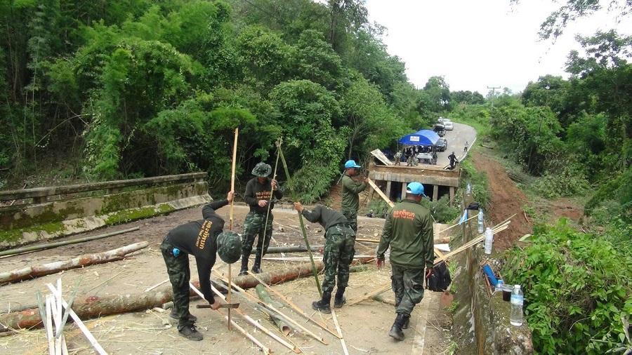 นายจวน จันเครื่อง ปลัดอำเภอเวียงสา ฝ่ายความมั่นคง จ.น่าน และ พ.ท.บัณฑิต ชาวกัณหา ผู้บังคับกองพันทหารม้าที่ 15 กรมทหารม้าที่ 2 พร้อมชุดเจ้าหน้าที่อุทยานแห่งชาติศรีน่าน และชาวบ้าน ช่วยกันทำสะพานไม้ชั่วคราวบรรเทาความเดือดร้อนในการสัญจรของชาวบ้าน เนื่องจากสะพานลำห้วยสาลี่ถูกน้ำป่าพัดขาด ชาวบ้านวนาไพร ม.7 ต.น้ำมวบ อ.เวียงสา จำนวน 47 หลังคาเรือน ไม่สามารถเดินทางเข้า-ออกพื้นที่ได้มาเป็นเวลา 4 วัน และสะพานดังกล่าวเป็นเส้นทางเดียวที่ใช้สัญจร พร้อมกันนี้ทีมแพทย์จากโรงพยาบาลค่ายสุริยพงษ์บริการตรวจรักษาโรคทั่วไป และจัดรถครัวสนามจากกองพันทหารม้าที่ 15 กรมทหารม้าที่ 2 เพื่อแจกจ่ายผู้เดือดร้อน