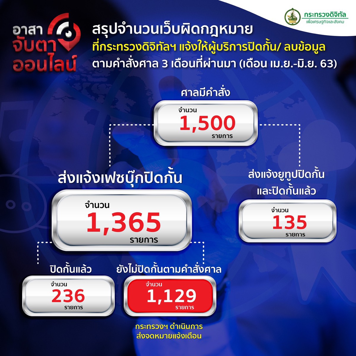 นายพุทธิพงษ์ ปุณณกันต์ รัฐมนตรีว่าการกระทรวงดิจิทัลเพื่อเศรษฐกิจและสังคม (ดีอีเอส) ได้โพสต์ข้อความผ่านทางเพจเฟซบุ๊ก ระบุว่า กระทรวงดิจิทัลฯ ได้เร่งรัดระบบรับเรื่องร้องเรียนสื่อออนไลน์ให้รวดเร็วยิ่งขึ้น ต้องตรวจสอบหลักฐานต่างๆ ให้เสร็จสิ้นภายใน 48 ชม. แล้วส่งให้ศาลอนุมัติคำสั่ง หลังจากนั้นรีบส่งให้ทาง บก.ปอท. และตำรวจที่เกี่ยวข้อง ไปตามจับผู้กระทำผิดโดยเร็ว ตลอดจนส่งต่อไปยังแพลตฟอร์มต่างประเทศ ให้ปิดเว็บหรือลบเนื้อหาที่ไม่เหมาะสม กระทรวงฯ บังคับใช้กฎหมายอย่างจริงจัง ตรวจสอบการดำเนินการตามคำสั่งศาล ตั้งแต่ เม.ย. – มิ.ย. 2563 (3 เดือนที่ผ่านมา) พบเว็บไซต์ที่มีเนื้อหาผิดกฎหมาย 1,500 ยูอาร์แอล แบ่งเป็นเฟซบุ๊ก 1,365 ยูอาร์แอล ระงับการเข้าถึงแล้วหรือปิดเพียง 236 ยูอาร์แอล และในขณะที่ยูทูปมี 135 ยูอาร์แอล ดำเนินการปิดทั้งหมด 135 ยูอาร์แอล โดยมีเนื้อหาผิดกฎหมายในเฟซบุ๊กที่ยังคงเปิดอยู่ 1,129 ยูอาร์แอล ยอมลบไปเพียง 236 ยูอาร์แอล วันนี้เราได้ส่งหนังสือแจ้งเตือน (Letter of Notice) ไปยังเฟซบุ๊กให้เร่งปิดกั้นเนื้อหาดังกล่าวโดยเร็ว หากไม่ดำเนินการภายใน 15 วัน อาจเข้าข่ายการกระทำความผิดตามมาตรา 27 พ.ร.บ. ว่าด้วยการกระทำความผิดเกี่ยวคอมพิวเตอร์ พ.ศ. 2550 และที่แก้ไขเพิ่มเติม (โทษปรับ 200,000 บาท หรือวันละ 5,000 บาท) ซึ่งจะดำเนินการทั้งคดีทางอาญา และเปรียบเทียบปรับ มาตรการนี้เป็นการบังคับใช้กฏหมายอย่างเด็ดขาดจริงจัง เพื่อให้ผู้ให้บริการแพลตฟอร์มต่างประเทศทุกๆ รายต้องดำเนินการภายใต้กฎหมายของไทยอย่างเคร่งครัด-สำนักข่าวไทย