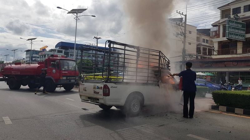 เมื่อเวลา 15.30 น. (11 ส.ค.) พ.ต.ท.สมรภูมิ สุโพธิ์ สารวัตร (สอบสวน) สภ.เมืองสมุทรสาคร ประสานดับเพลิงเทศบาลนครสมุทรสาคร และเจ้าหน้าที่กู้ภัยมูลนิธิการกุศลสมุทรสาคร เข้าช่วยเหลือเหตุไฟไหม้รถกระบะ สีขาว ติดโครงกั้นเหล็ก ทะเบียน ตส 9377 กรุงเทพมหานคร บริเวณเกาะกลางถนนเอกชัย ตรงข้ามโรงพยาบาลสมุทรสาคร เจ้าหน้าที่ต้องปิดกั้นการจราจรชั่วคราวและเร่งฉีดน้ำสกัด ท่ามกลางเสียงดังปะทุเป็นระยะ หลังผ่านไปเกือบ 10 นาที สามารถดับไฟได้อย่างสนิท