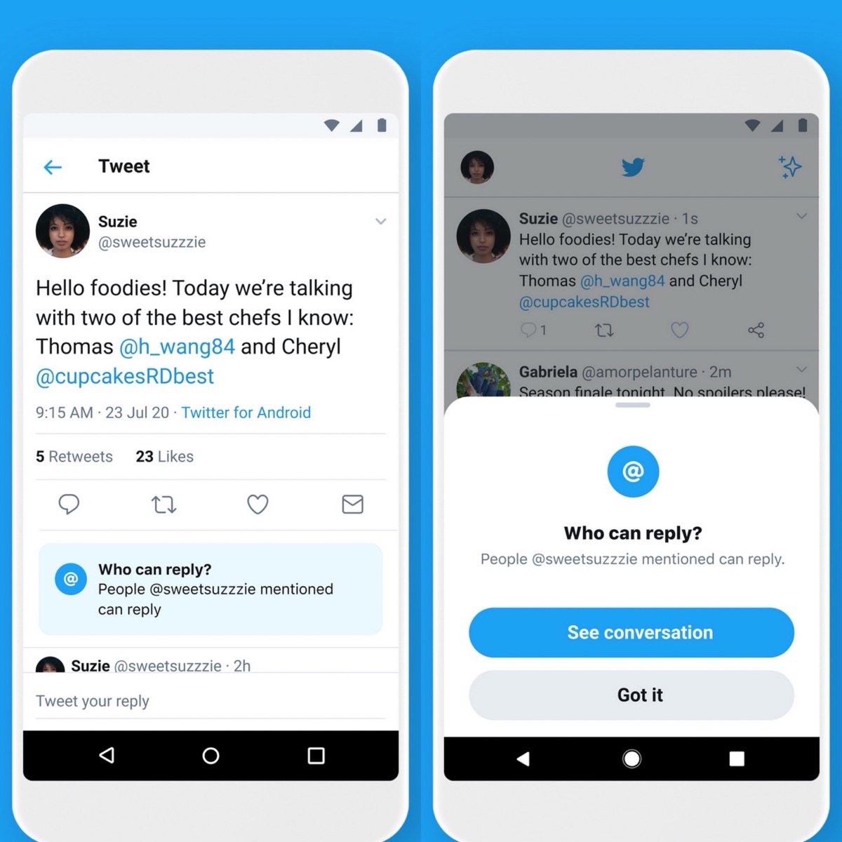 ทวิตเตอร์ได้ทำการทดสอบการตั้งค่าบทสนทนารูปแบบใหม่เพื่อให้ผู้ใช้งานสามารถควบคุมบทสนทนาที่สร้างขึ้น โดยผู้ใช้งานทวิตเตอร์สามารถใช้การตั้งค่ารูปแบบใหม่นี้เพื่อจำกัดการตอบทวีตบทสนทนา ป้องกันข้อความตอบกลับที่ไม่ต้องการ เพื่อจะได้ไม่รบกวนบทสนทนาที่มีความสำคัญ