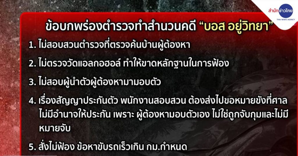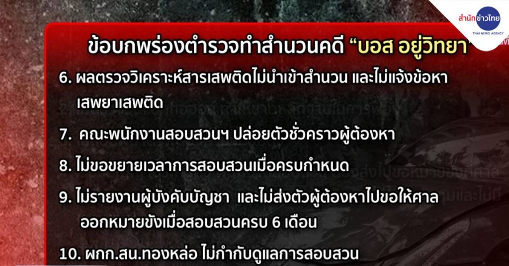 กรุงเทพฯ 13 ส.ค.- สำนักงานตำรวจแห่งชาติผ่าทางตันคดี “บอส วรยุทธ อยู่วิทยา” เสนอสอบสวนข้อหาขับรถโดยประมาทเป็นเหตุให้ผู้อื่นถึงแก่ความตาย ที่สั่งไม่แย้งคำสั่งอัยการ และตั้งข้อหาใหม่เสพโคเคน พร้อมตั้งกรรมการสอบ พล.ต.ท.เพิ่มพูน ชิดชอบ ผู้ช่วยผู้บัญชาการตำรวจแห่งชาติ และนายตำรวจที่เกี่ยวข้อง 20 นาย ติดตามจากทีมอาชญากรรม สำนักข่าวไทย