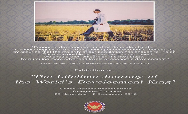 ผู้สื่อข่าวรายงานว่า ทวิตเตอร์ของคณะผู้แทนถาวรไทยประจำสหประชาชาติ(ยูเอ็น) ณ นครนิวยอร์ก สหรัฐอเมริกา ได้โพสต์ข้อความระบุว่า ที่อาคารสำนักงานใหญ่สหประชาชาติ นครนิวยอร์ก สหรัฐอเมริกาได้จัดนิทรรศการเทิดพระเกียรติพระบาทสมเด็จพระปรมินทรมหาภูมิพลอดุลยเดช ภายใต้หัวข้อ “The lifetime journey of the world’s development king” พระราชประวัติแห่งกษัตริย์นักพัฒนาของโลก โดยจัดแสดงพระบรมฉายาลักษณ์และเรื่องราวของพระราชกรณียกิจต่างๆ รวมถึงพระบรมสาทิศลักษณ์ จำนวน 9 ภาพที่วาดโดยนักเรียนวิทยาลัยเพาะช่าง มหาวิทยาลัยเทคโนโลยีราชมงคลรัตนโกสินทร์