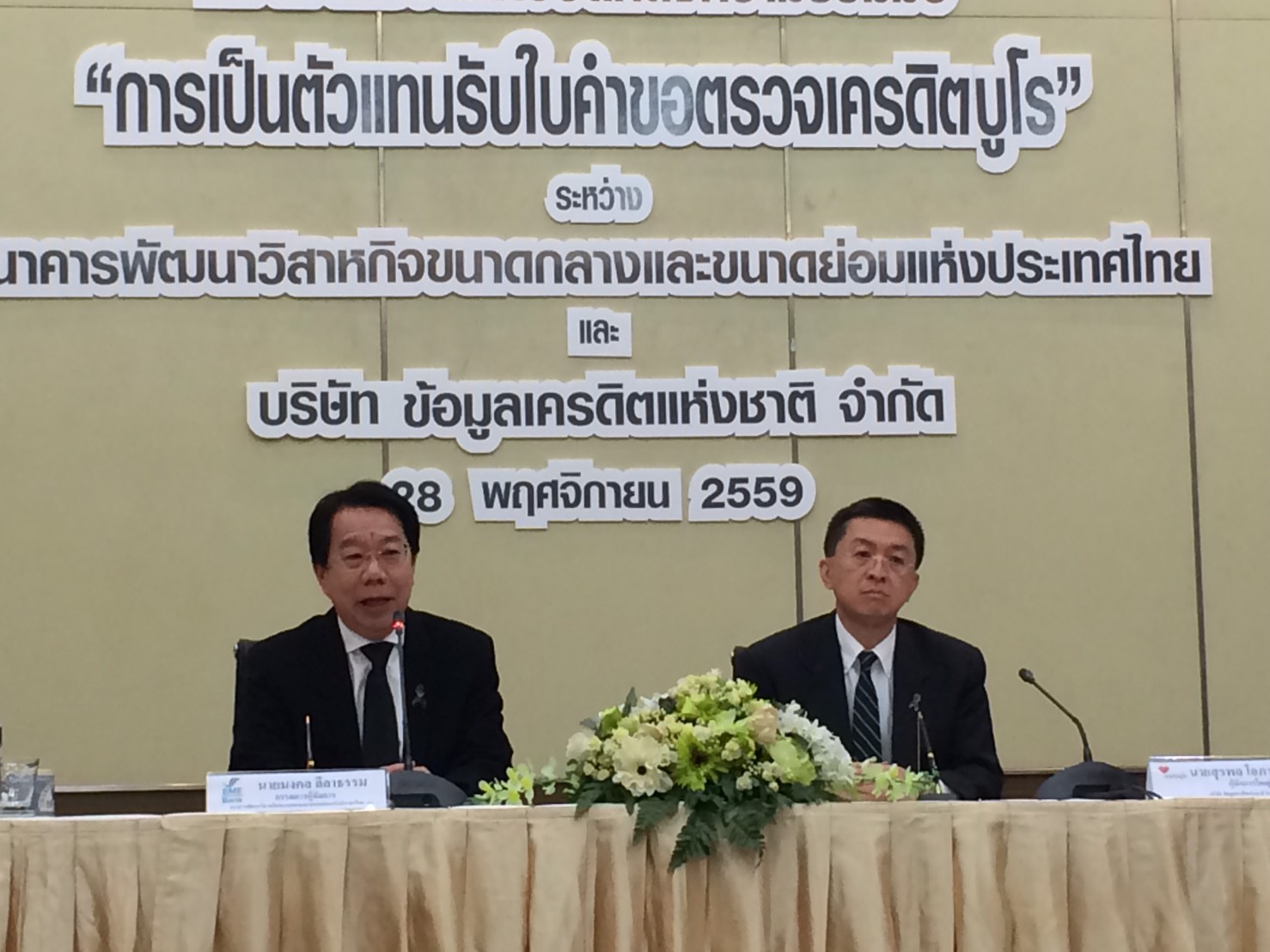 นายมงคล ลีลาธรรม กรรมการผู้จัดการ ธนาคารพัฒนาวิสาหกิจขนาดกลางและขนาดย่อมแห่งประเทศไทย (ธพว. หรือ SME Development Bank) ลงนามในบันทึกข้อตกลงความร่วมมือกับนายสุรพล โอภาสเสถียร ผู้จัดการใหญ่ บริษัท ข้อมูลเครดิตแห่งชาติ จำกัด (เครดิตบูโร) เพื่อเป็นตัวแทน “รับใบคำขอตรวจเครดิตบูโร” ผ่านที่ทำการสาขาของเอสเอ็มอีแบงก์ 95 สาขาทั่วประเทศ ให้กับบุคคลทั่วไป เพื่ออำนวยความสะดวกรวดเร็วในการตรวจสอบประวัติทางการเงินของตนเอง ผ่าน Counter Service เอสเอ็มอีแบงก์ นำร่อง 4 สาขา ประกอบด้วย สาขาเชียงใหม่ สาขาขอนแก่น สาขาพิษณุโลก และสาขาสุราษฎร์ธานี เนื่องจากเป็นสาขาที่ตั้งอยู่ในจังหวัดใหญ่ที่มีศักยภาพทางเศรษฐกิจ มีผู้ประกอบการทำธุรกิจการค้า หรือธุรกรรมทางการเงินจำนวนมาก
