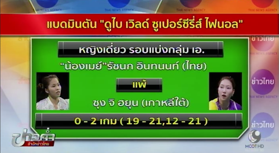 ดูไบ 14 ธ.ค.-“เมย์” รัชนก อินทนนท์ ประเดิมศึกแบดมินตันดูไบ เวิลด์ ซูเปอร์ซีรีส์ ไฟนอล ได้ไม่ดี พ่ายให้กับ ซุง จิ ฮยุน มือ 5 ของโลก จากเกาหลีใต้ ในรอบแบ่งกลุ่ม นัดแรก กลุ่มเอ
