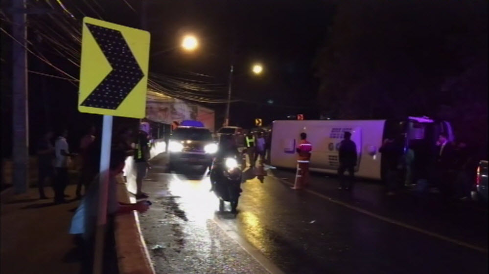สุราษฎร์ธานี 28 พ.ย. – เมื่อวานนี้ (27 พ.ย.) เวลา 19.40 น. เกิดอุบัติเหตุรถทัวร์นักท่องเที่ยวพลิกคว่ำบริเวณจุดชมวิวขาเข้าหาดเฉวง ถนนทวีราษฎร์ภักดี (สายรอบเกาะ) หมู่ 6 ต.บ่อผุด อ.เกาะสมุย จ.สุราษฎร์ธานี มีผู้ได้รับบาดเจ็บ 16 ราย จุดเกิดเหตุเป็นทางลาดลงเขาและโค้งหักศอก พบรถทัวร์ 6 ล้อ อยู่ในสภาพพลิกตะแคง มีรอยไถลกับถนน ด้านหน้ารถไปชนกับรางระบายน้ำข้างถนนจนได้รับความเสียหาย